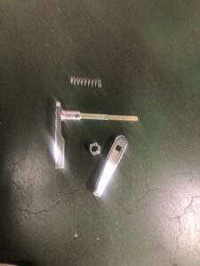 オーバードアのパネルにあるハンドルの交換作業を行いました。このハンドルは左右レールまでワイヤーでつながったラッチ錠を開錠するのに操作するハンドルです。通常は下向きで開錠する時に右45度に回してパネル取っ手を上に引き上げながらオーバードアを持ち上げるという動作になります。