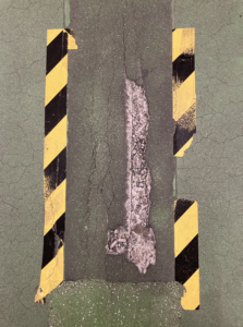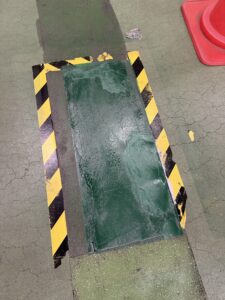 写真のような数センチ程度の劣化やひび割れ以外で大きな補修範囲になる場合は、カッターを入れて2液性のポリマー樹脂を色付けしてから流し込むこともあります。ご要望によっては幼児向けの園庭などで使われるゴムチップで施工することも可能です。ただし、日常的に稼働する場所だと作業時から完全に硬化するまで立入禁止になるので施工制限が常にかかる場所だと厳しいかもしれません。